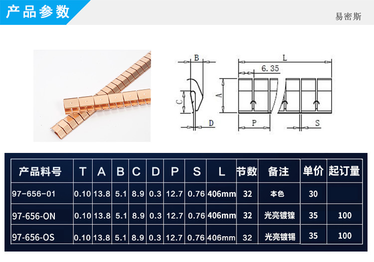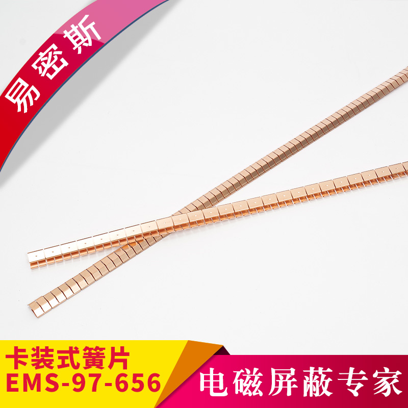 易密斯™鈹銅簧片是用特殊合金鈹銅制成的指形簧片,使高等級EMI屏蔽效果和彈性鉤爪擦與小封閉力特性相結(jié)合。鈹銅的高性能參數(shù):拉伸強(qiáng)度高、防腐性能好和導(dǎo)電性能佳,使得它成為一種用在寬頻段的理想EMI屏蔽材料。鈹銅簧片能在多種環(huán)境中良好工作,能選擇多種鍍層來確保與其他接觸表面的電化學(xué)兼容性,它不會(huì)燃燒,也不會(huì)受射線或紫外線的影響。由于這些原因,可用在存在EMI/RFI或者ESD問題的范圍很廣的電子設(shè)備中,用于各種屏蔽室、艙門、機(jī)箱門、蓋板、印刷板插板、集成電路屏蔽等。在計(jì)算中心機(jī)、軍用導(dǎo)航系統(tǒng)接收機(jī)和其它電子設(shè)備中都使用鈹銅彈片來進(jìn)行EMI屏蔽。 易密斯™鈹銅簧片現(xiàn)有60余款標(biāo)準(zhǔn)件可供選擇,同時(shí)可支持定制。