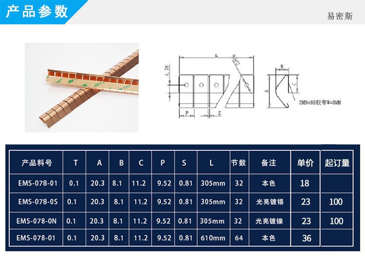 EMS易密斯,2009年創(chuàng)立于昆山,主要產(chǎn)品為EMI鈹銅簧片、不銹鋼彈片、導(dǎo)電泡棉和其他配套電子材料,是目前華東最具規(guī)模、產(chǎn)品最齊全的民用電子設(shè)備EMI電磁干擾屏蔽材料解決方案提供商。