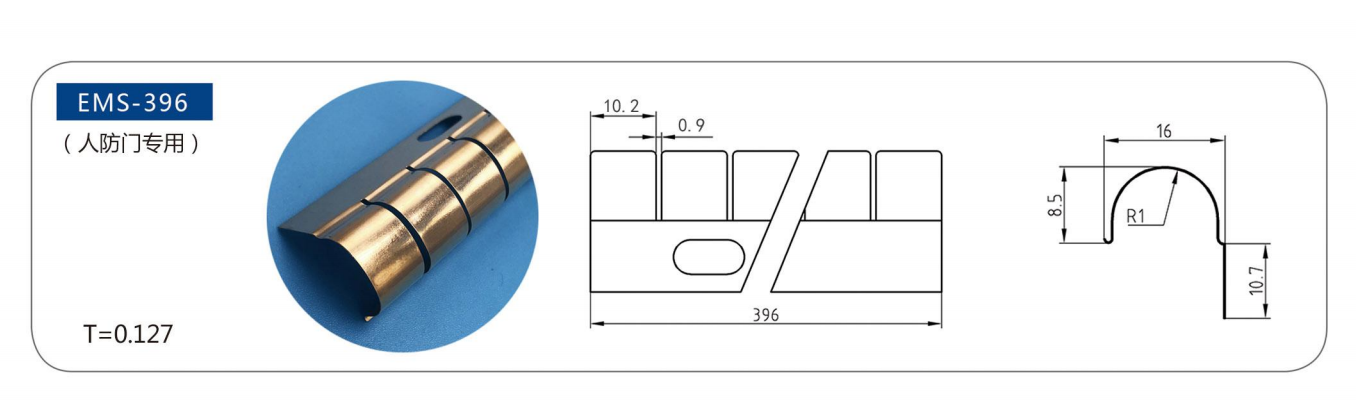 總參設(shè)計(jì)院S6-Dg-40-90寬16mm人防門專用屏蔽鈹銅簧片對應(yīng)我司人防門簧片料號(hào)EMS-396,該人防門專用鈹銅簧片適合大多數(shù)人防門,應(yīng)用易密斯人防門專用簧片后,此類人防門具有防護(hù)、密閉、屏蔽或密閉、屏蔽的復(fù)合功能。易密斯™鈹銅簧片由具有電磁兼容屏蔽效果的進(jìn)口鈹銅合金C17200制成,具有優(yōu)秀的抗壓性、回彈性和耐腐蝕性,并提供很好的寬頻電磁屏蔽效果,特別適用于通訊機(jī)柜、電腦、屏蔽室/門、面板及插拔件的間隙填充。易密斯™鈹銅簧片現(xiàn)有200余款標(biāo)準(zhǔn)件可供選擇,同時(shí)可支持定制。