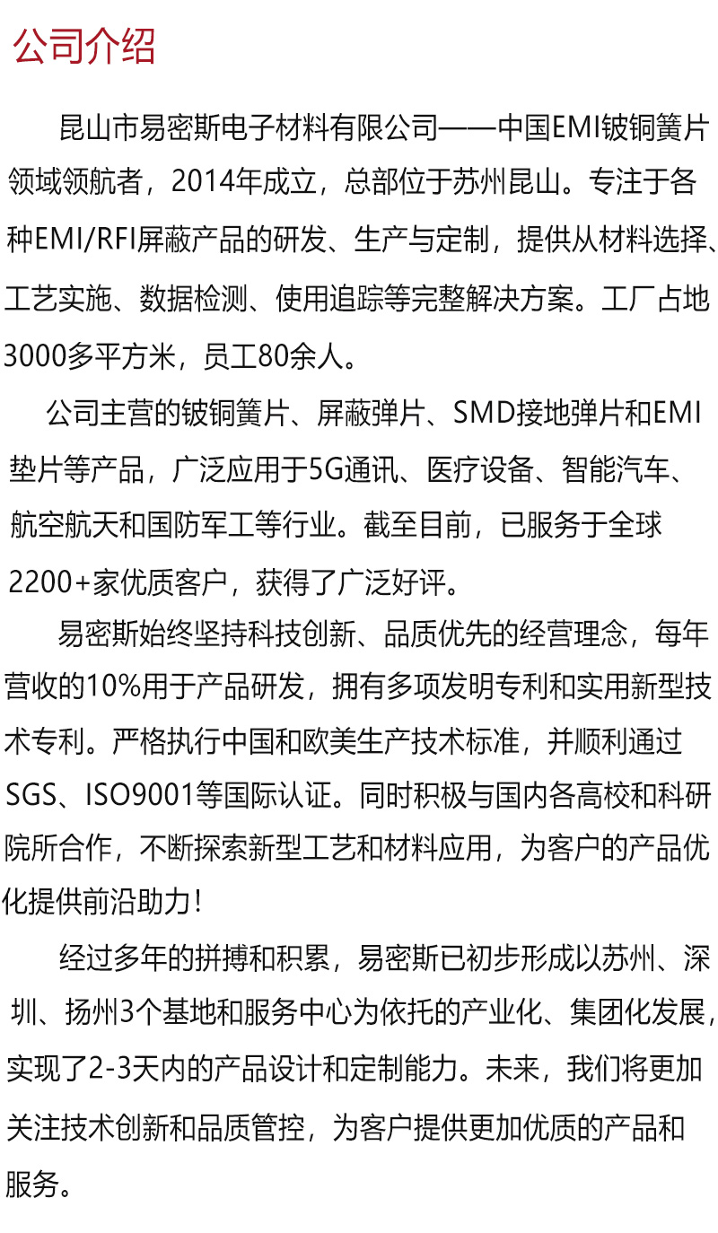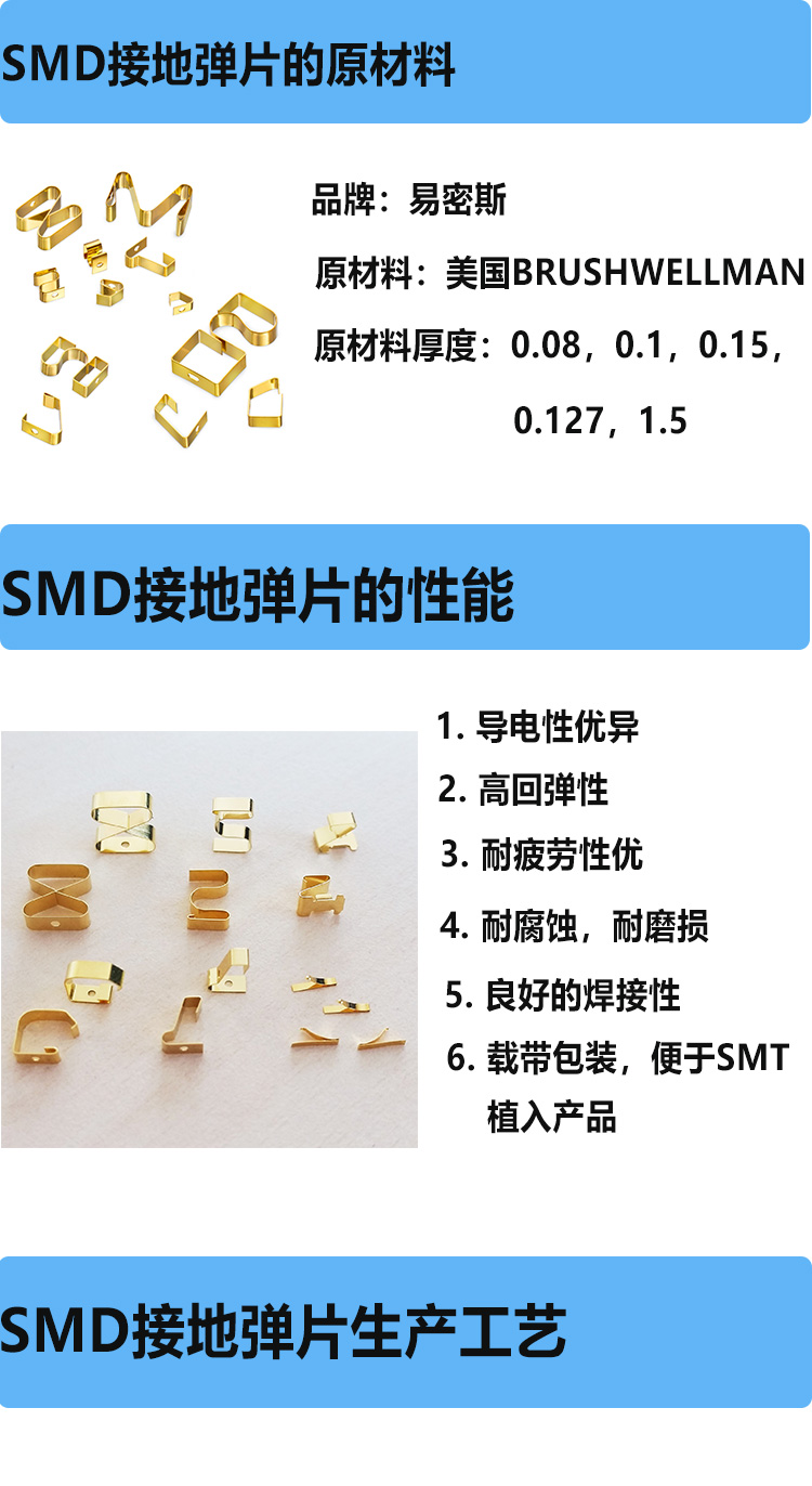江浙滬汽車電子彈片多少錢,一款好的鈹銅彈片,不僅要具有價格優(yōu)勢,同時要能滿足廠家對質(zhì)量和屏蔽效能的需求,所以江浙滬的朋友在考慮鈹銅彈片多少錢的同時,更要注重所采購的電子彈片質(zhì)量的穩(wěn)定性。易密斯鈹銅彈片作為國內(nèi)電磁屏簧片行業(yè)翹楚者,有著10年以上工廠經(jīng)驗(yàn)和全套進(jìn)口生產(chǎn)設(shè)備,產(chǎn)品已通過ISO9001質(zhì)量體系認(rèn)證。已成功為眾多上市企業(yè)提供了優(yōu)良產(chǎn)品和貼心服務(wù)。